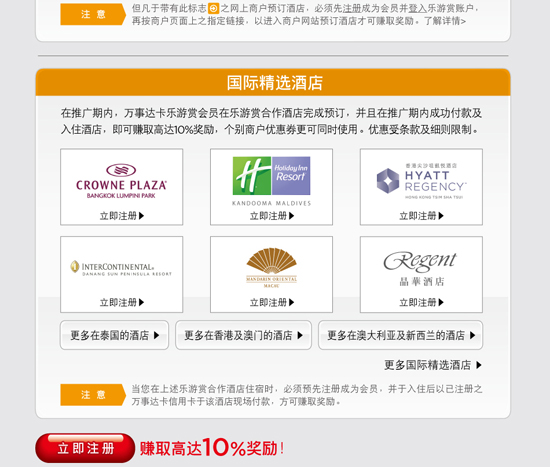 暑期马上就要到来,旅游旺季即将开始。即日起到831日,刷万事达卡可专享高达10%奖励。个别商户优惠券更可同时使用。乐游赏酒店合作商户包括各大酒店预订网及国际酒店。活动详情请登录www.mastercard.com/cn优惠礼遇——“入住星级酒店刷万事达卡专享高达10%奖励活动专区进行了解。建行万事达理财金卡持卡人、白金卡持卡人、万事达信用卡持卡人均可享受活动优惠(详见图例)